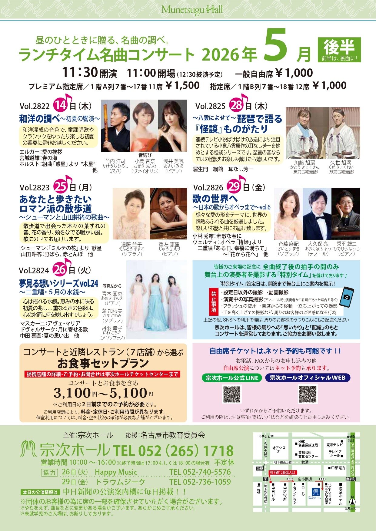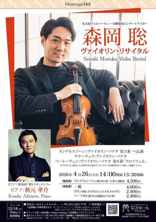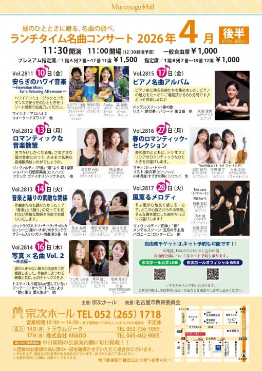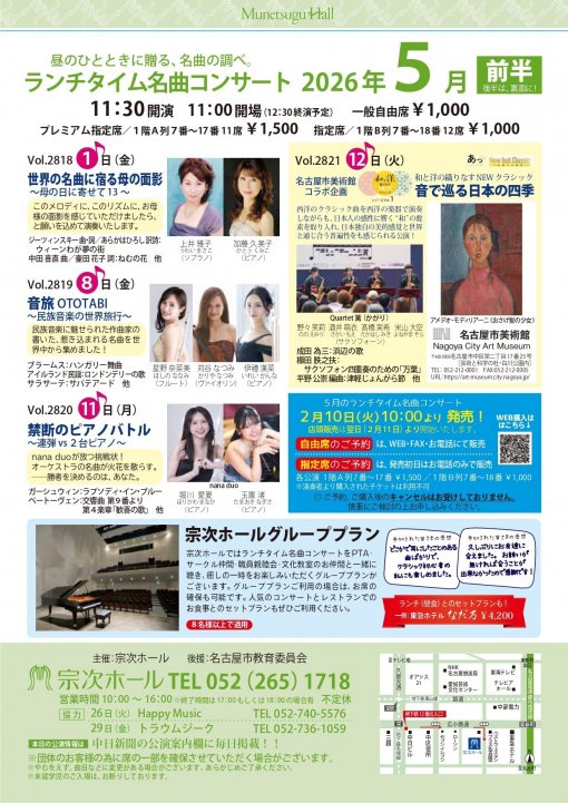 お知らせ 2026年3月13日 チラシ・ギャラリー このページでは、この先の宗次ホール主催公演のチラシを一度にぱっと見ることができるコーナーです。どうぞコンサート選びにお役立てください。 2月の公演 3月8日(日)・9日(月)・15日(… アンコール&当日発表プログラム…