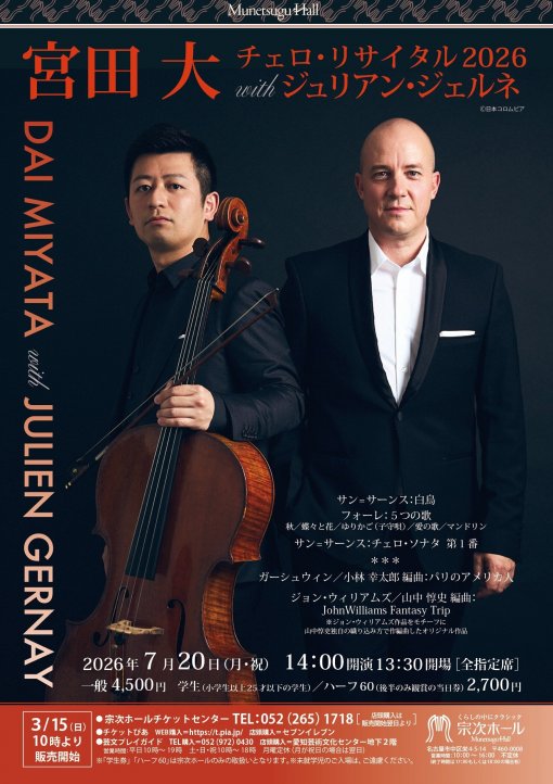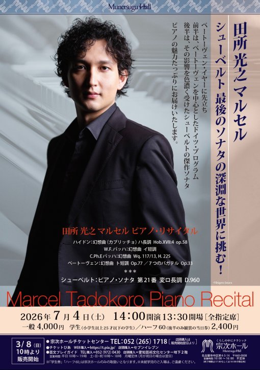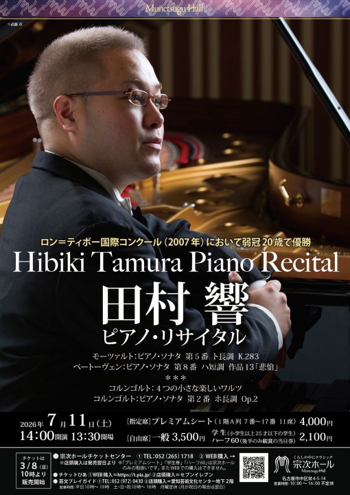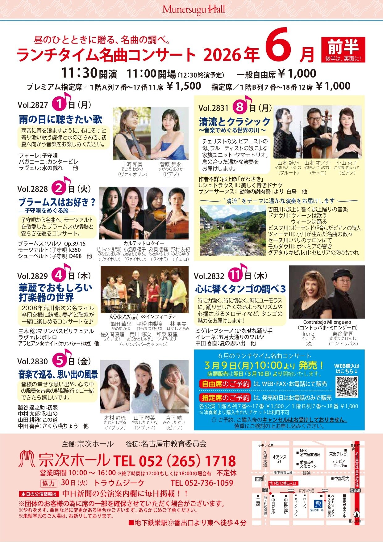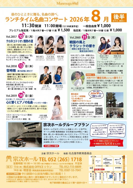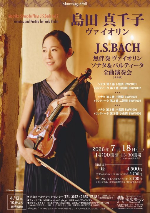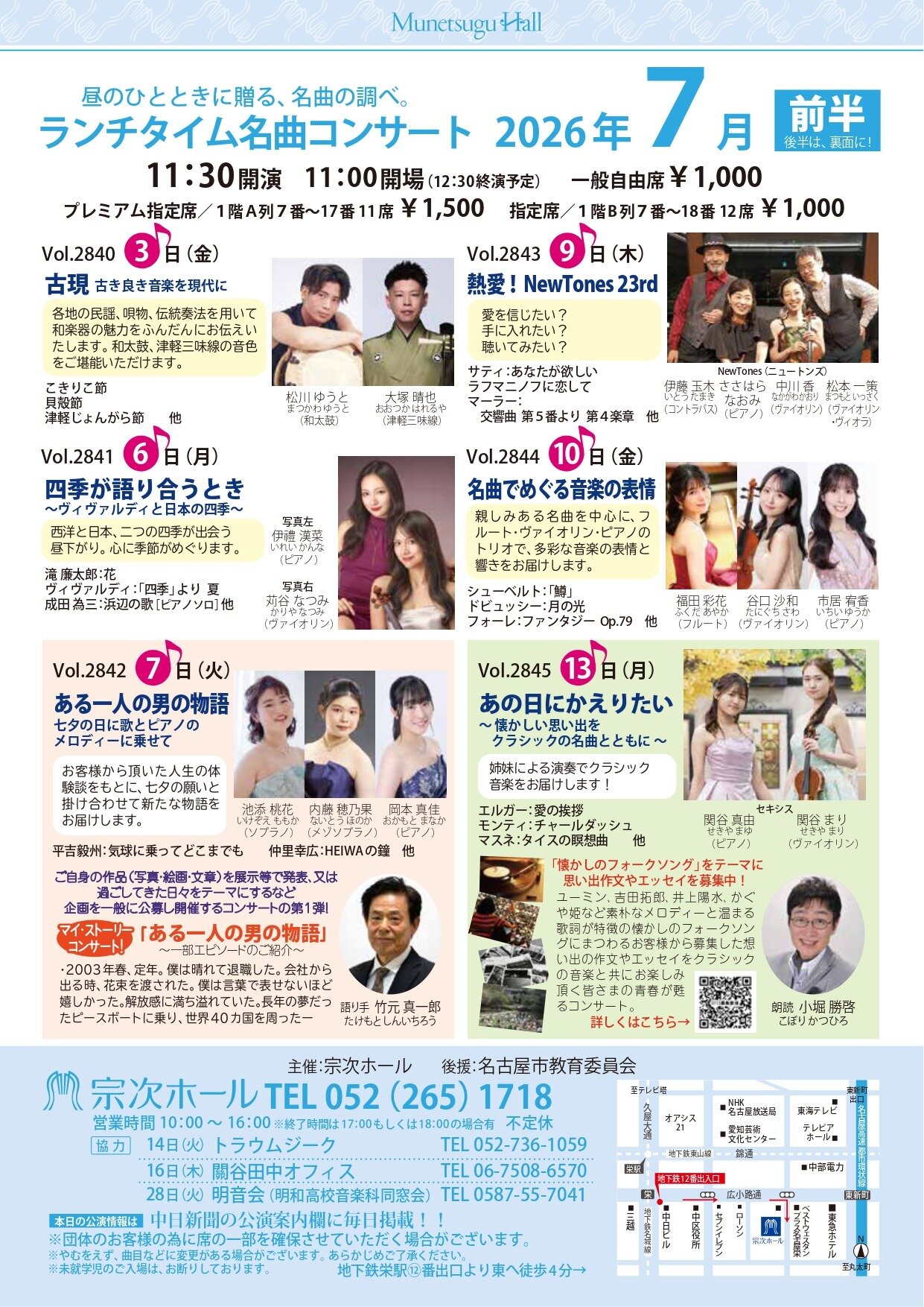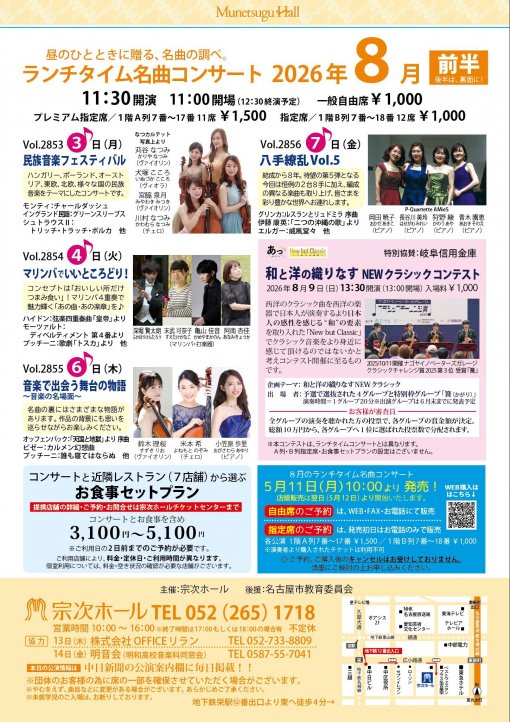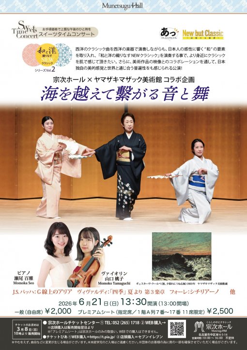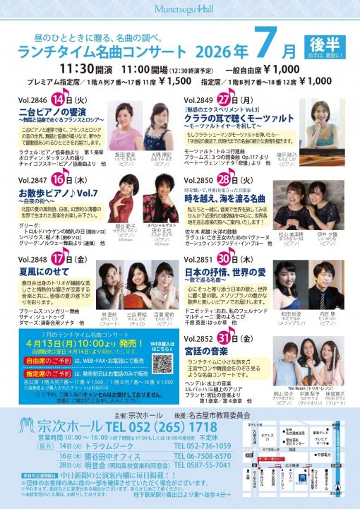 お知らせ 2026年3月13日 チラシ・ギャラリー このページでは、この先の宗次ホール主催公演のチラシを一度にぱっと見ることができるコーナーです。どうぞコンサート選びにお役立てください。 「夏の景色〜花、空、海、川、花… 4月12日(日)・13日(月)・19日…