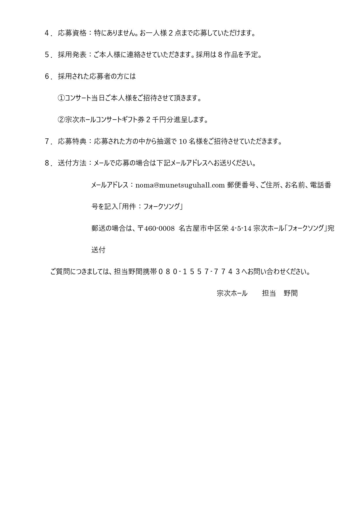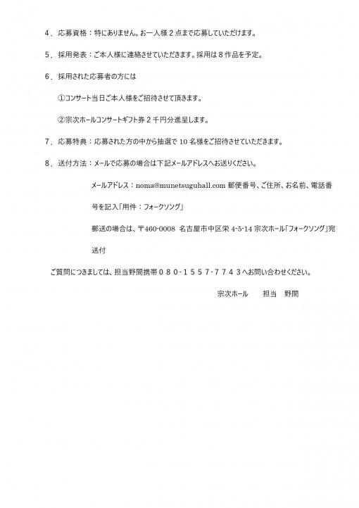 メールアドレス:noma@munetsuguhall.com 郵便番号、ご住所、お名前、電話番号を記入「用件:フォークソング」