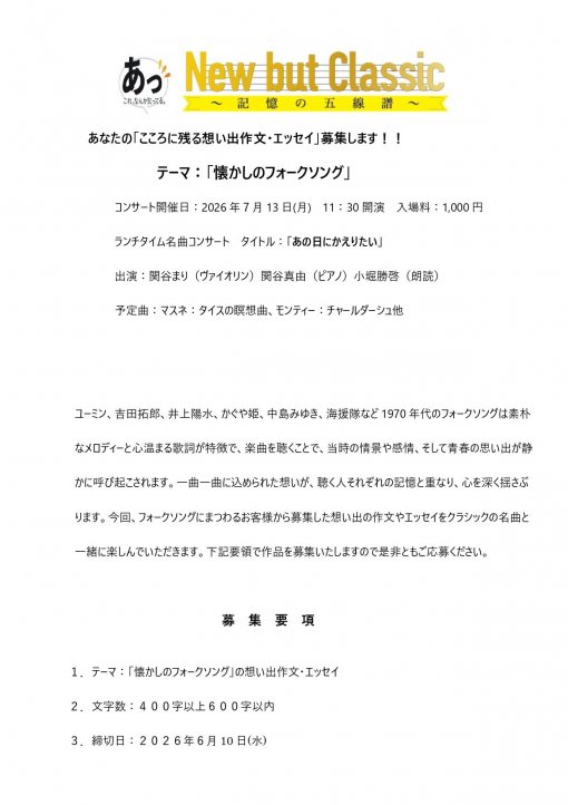 ユーミン、吉田拓郎、井上陽水、かぐや姫、中島みゆき、海援隊など1970年代のフォークソングは素朴なメロディーと心温まる歌詞が特徴で、楽曲を聴くことで、当時の情景や感情、そして青春の思い出が静かに呼び起こされます。一曲一曲に込められた想いが、聴く人それぞれの記憶と重なり、心を深く揺さぶります。今回、フォークソングにまつわるお客様から募集した想い出の作文やエッセイをクラシックの名曲と一緒に楽しんでいただきます。下記要領で作品を募集いたしますので是非ともご応募ください。