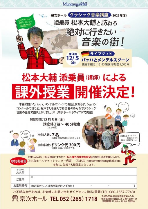 本編で聞いたバッハ、メンデルスゾーンのお話しに限らず、ショパンコンクールの話など、松本さんを囲んで参加者のみんなでクラシック音楽の話題で盛り上がりましょう![宗次ホールホワイエにて開催]