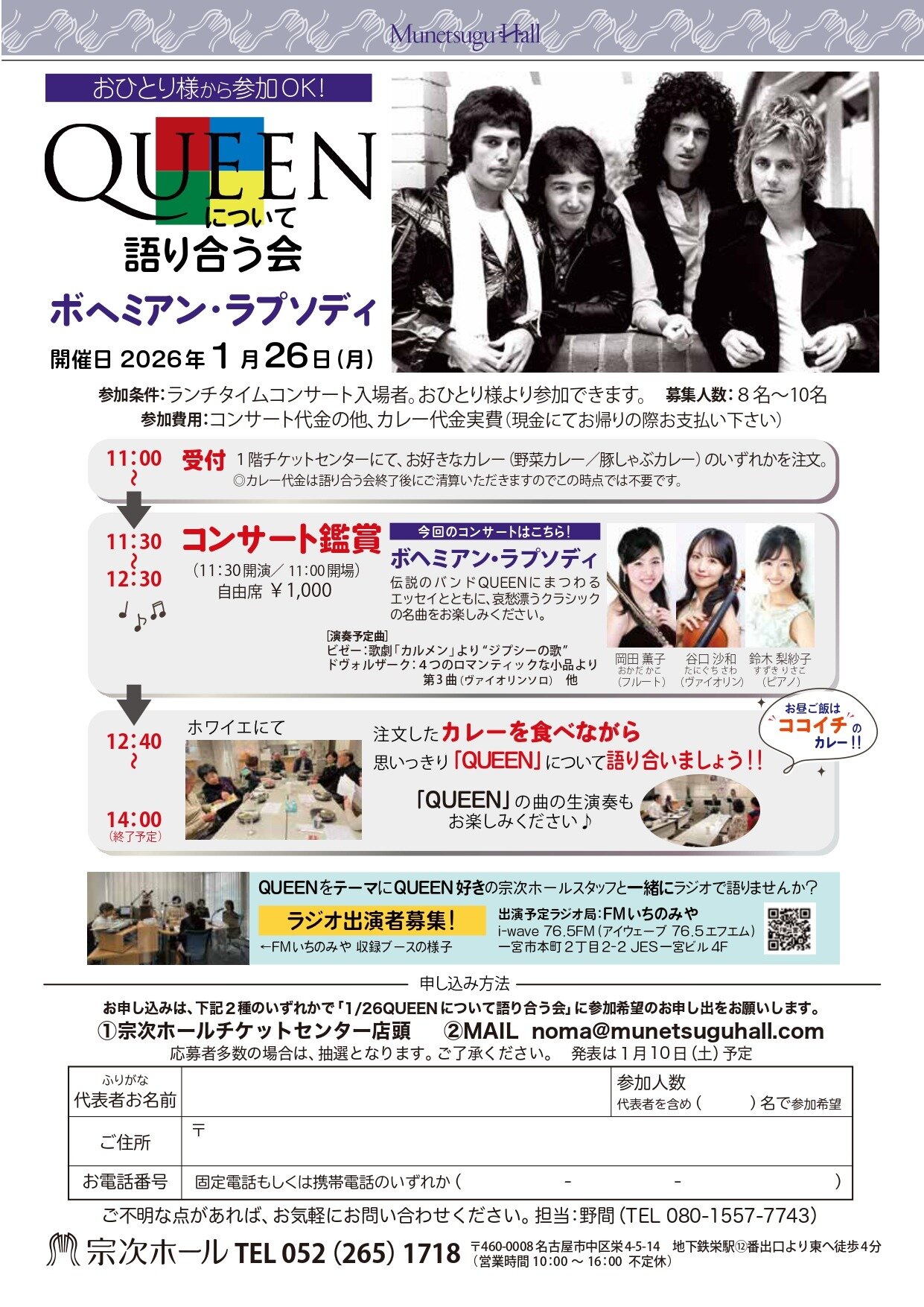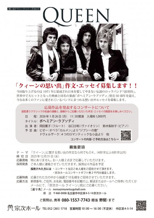 世界中で大ヒットとなった映画と同名の楽曲「ボヘミアン・ラプソディ」発売50周年をむかえ、今なお多くのファンに愛されているバンドにまつわる想い出やエッセイを朗読します。哀愁漂うクラシックの名曲の演奏と、皆様からご応募いただいた作文・エッセイの朗読をお楽しみください。