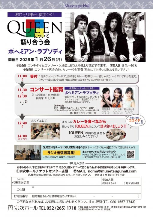 応募方法:郵便番号、ご住所、お名前、電話番号を記載の上、郵送またはホールへご持参いただくか、メールにて「宗次ホール クイーン」宛にご応募ください。