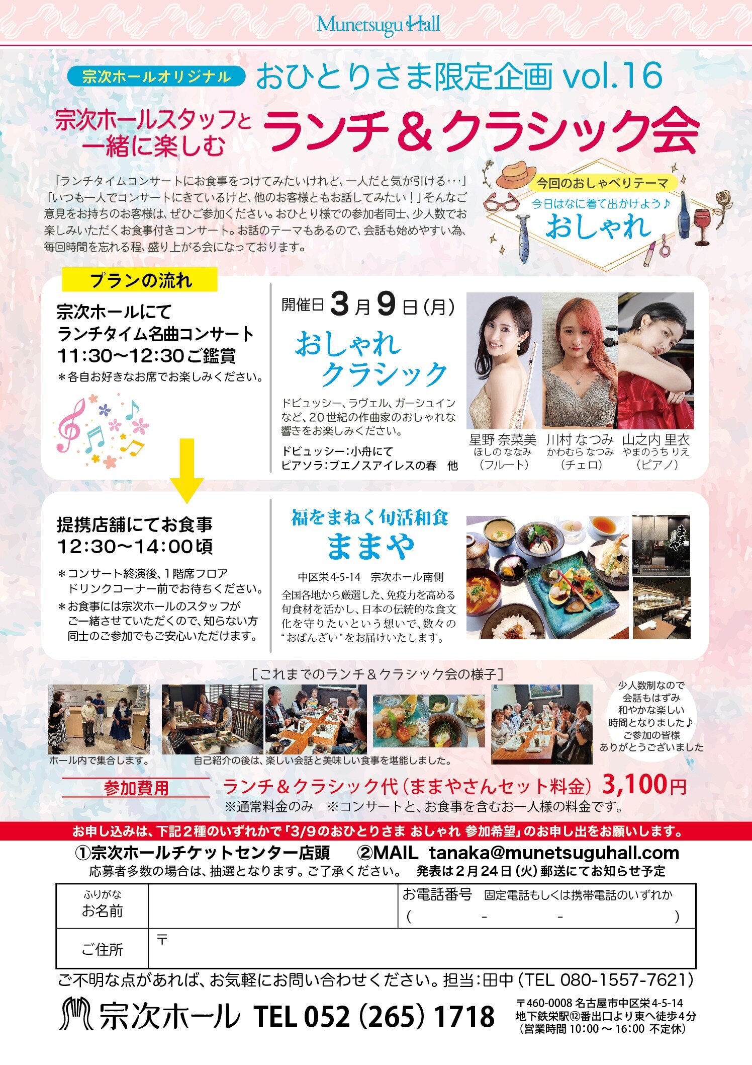 お申し込みは、下記2種のいずれかで「3/9のおひとりさま おしゃれ 参加希望」のお申し出をお願いします。