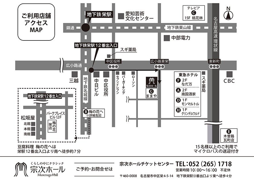 - 宗次ホールチケットセンター(052-265-1718)へ予約TEL(ご予約者様のお名前、ご連絡先、利用希望の飲食店、お支払い方法などを承ります)